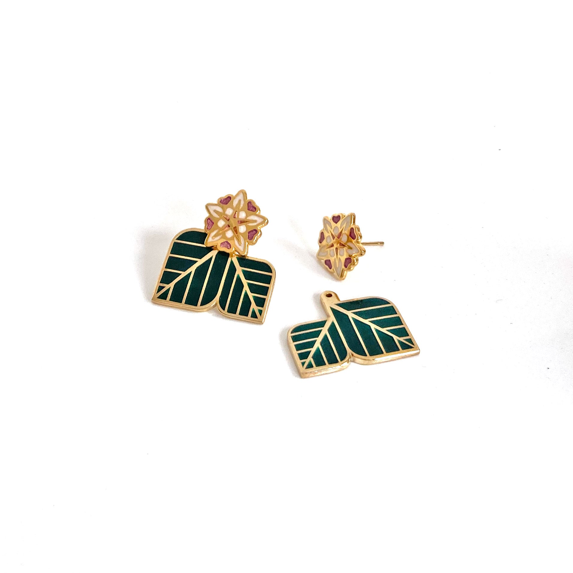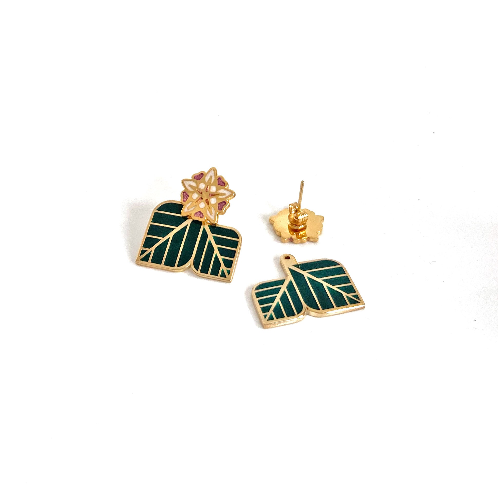 enamel cacao flower studs with leaf ear jackets