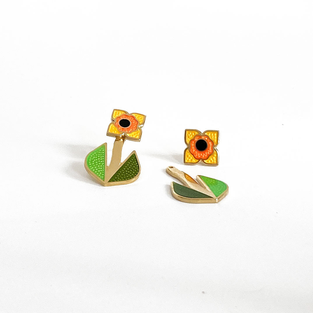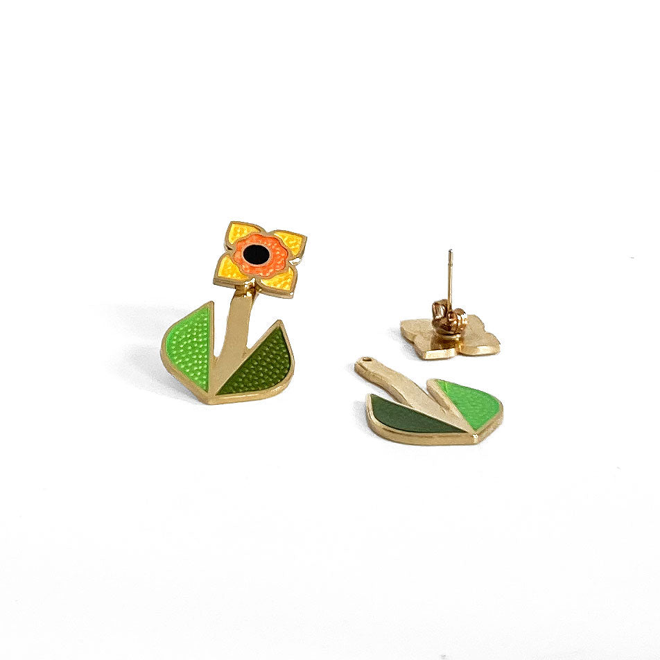 enamel daffodil flower studs with leaf ear jackets