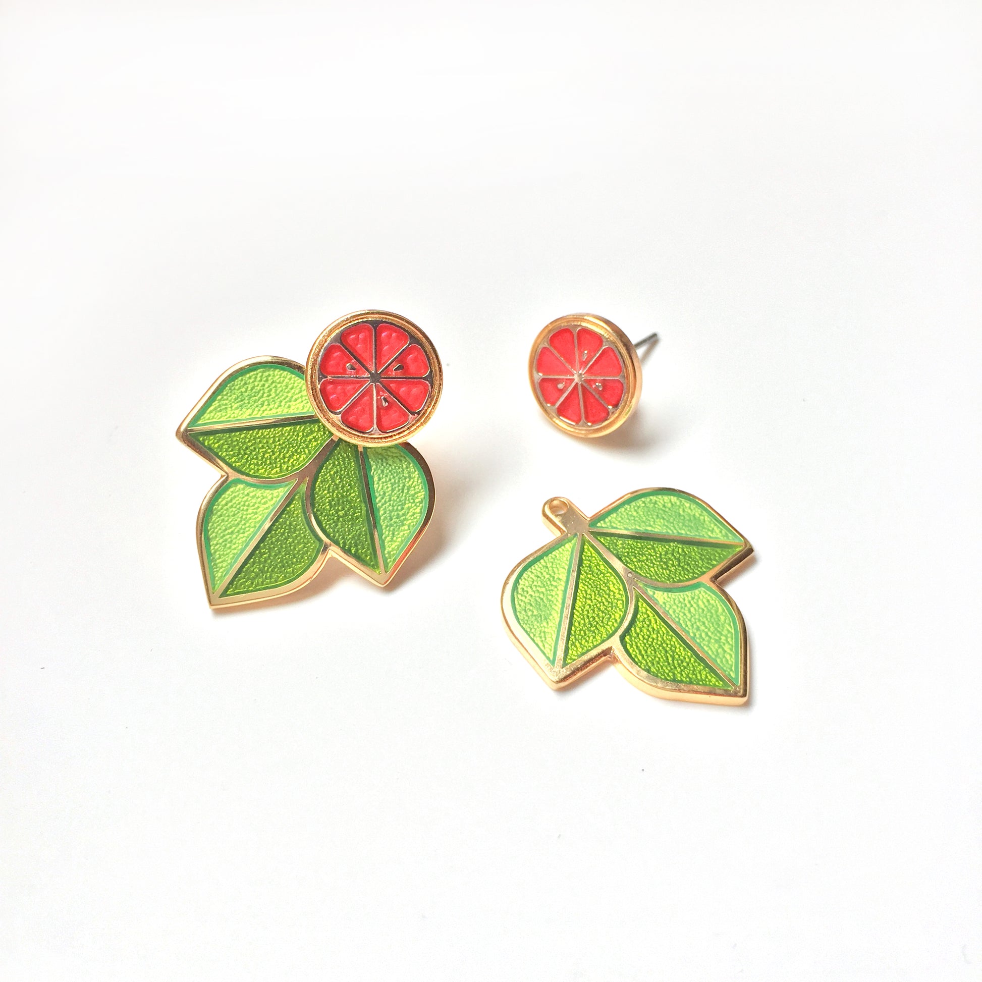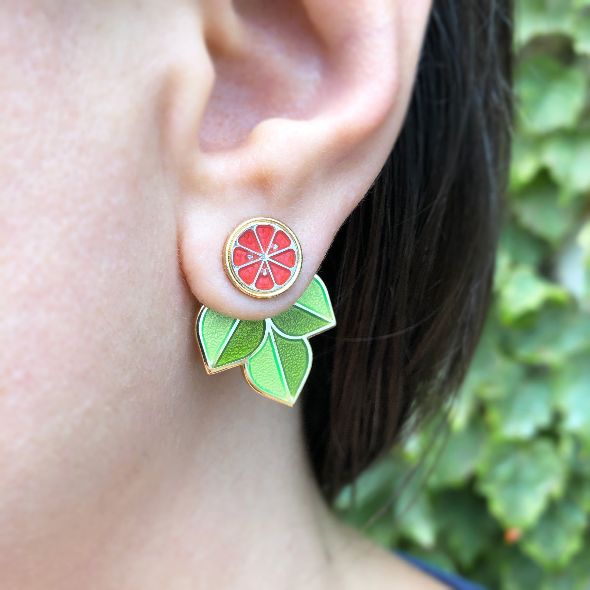enamel grapefruit studs with leaf ear jackets